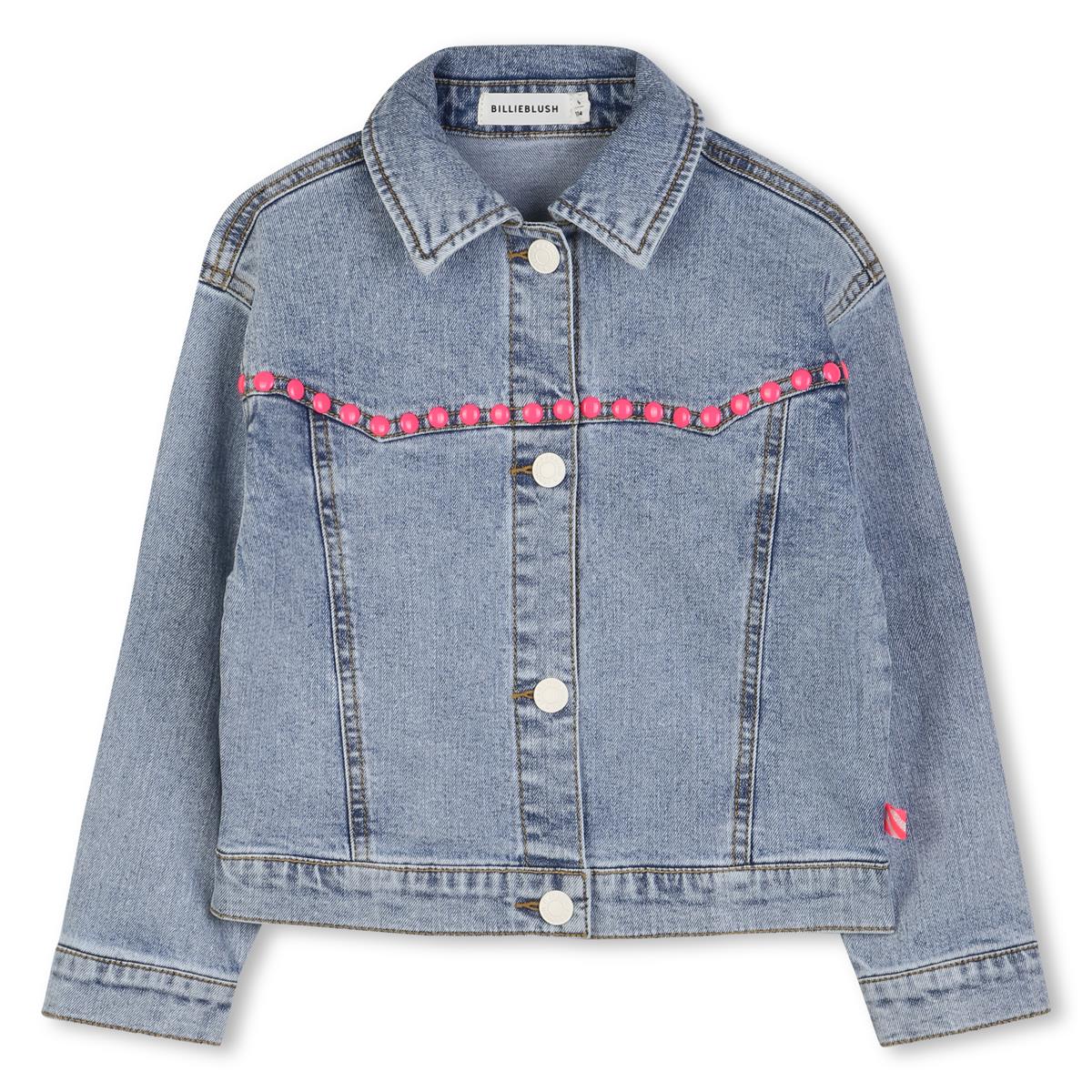 Denim jacket with fancy studs, fancy sequin badge on the back, press stud opening.