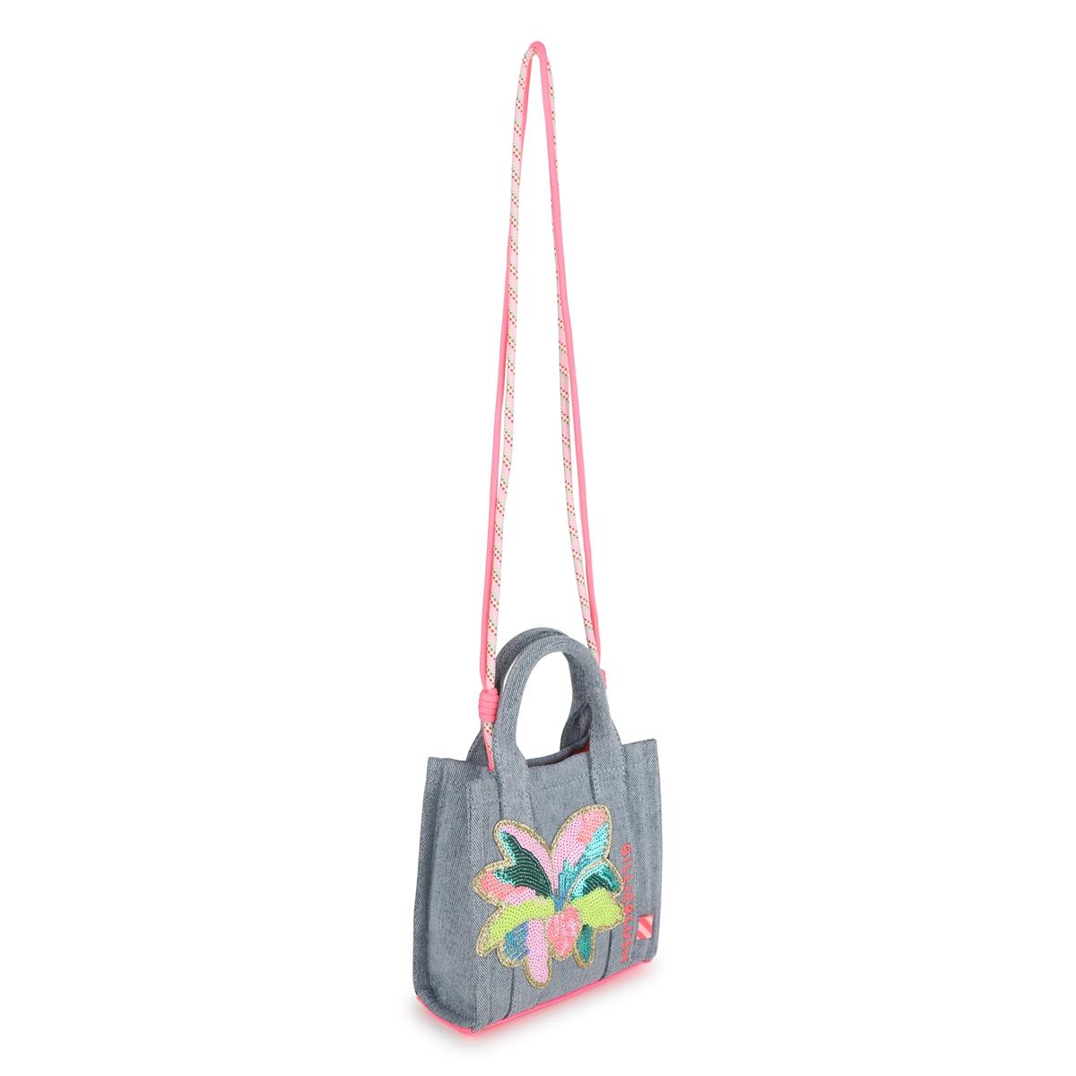 Mini-tas handtas. Denim en gecoat textiel tandvleeseffect. Pailletten gebladerte illustratie glanzend en gedrukt logo. Schouderband van touw veelkleurig. Magneetsluiting. Geweven etiket gekrast. Afmetingen: 14,5x14,5x5 cm.